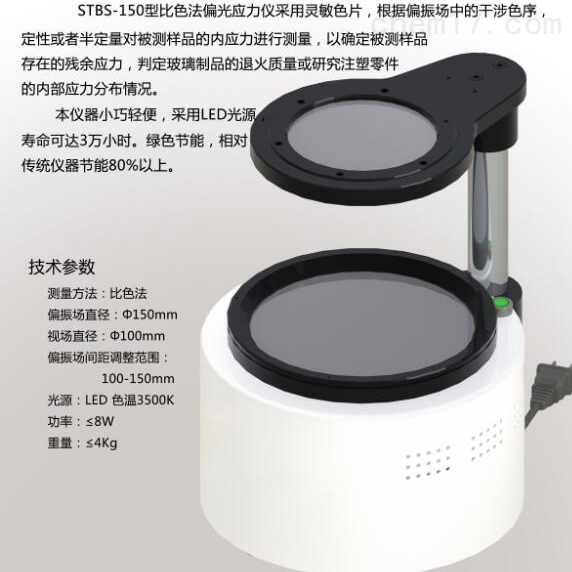 STBS-150 型比(bǐ)色法偏(pian)光應力(lì)儀由北(bei)京北科(ke)創展科(kē)技有限(xian)公司研(yán)制開發(fa),是對玻(bo)璃制品或(huò)透明塑(sù)料制品(pǐn)等被測(cè)樣件進(jin)行殘餘(yú)應力檢(jian)測的專(zhuan)用儀器(qi),它是應(ying)用偏振(zhen)光幹涉(shè)原(yuan)理檢查(chá)玻璃或(huò)透明塑(su)料制品(pǐn)内應力(lì)的儀器(qi)。
